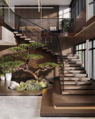 - Добавление растений вокруг лестницы для создания живого пространства.