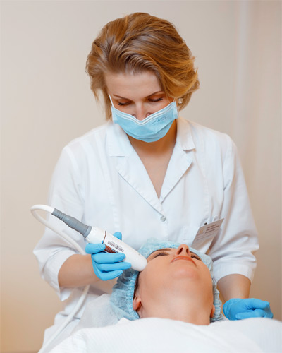 - Косметолог наносит на лицо контактный гель, после чего на определенную глубину подается ультразвуковой импульс.